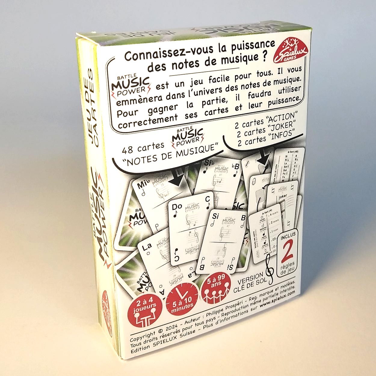 Contenu de la boîte : 48 cartes BATTLE MUSIC POWER « notes de musique », 2 cartes « ACTION », 2 cartes « JOKER », 2 cartes « INFOS ».