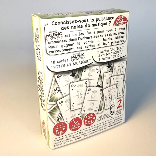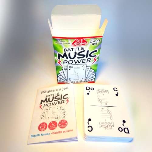Battle MUSIC Power est un jeu de cartes sur l'univers des notes de musique. Vous découvrirez que les notes ont une puissance en jouant à la bataille fermée ou ouverte. Pour novices, débutants et musiciens confirmés.